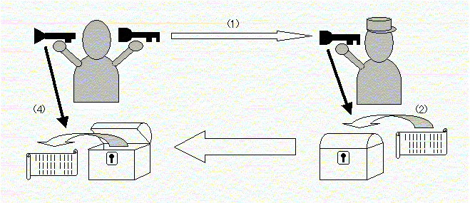 「あなたが私から秘密の文章を受け取りたいときには、あなたは暗号の鍵を 2つ用意します。片方で閉めたら、もう片方でしかあきません。例えばAとい う鍵で閉めたら、もう1個のBでしか開きません。逆にBで閉めたらAでしか 開きません。そこで、まずどちらかの鍵をネットワークで私に送って下さい。 私はそれを使ってあなたに送る秘密文章に鍵をかけます。つまり、秘密文章を 暗号化するわけですから、中身は誰にも読めません。この文章をネットワーク であなたに送りますから、受け取ったあなたはそれを持っているもう片方の鍵 で開けてください。」